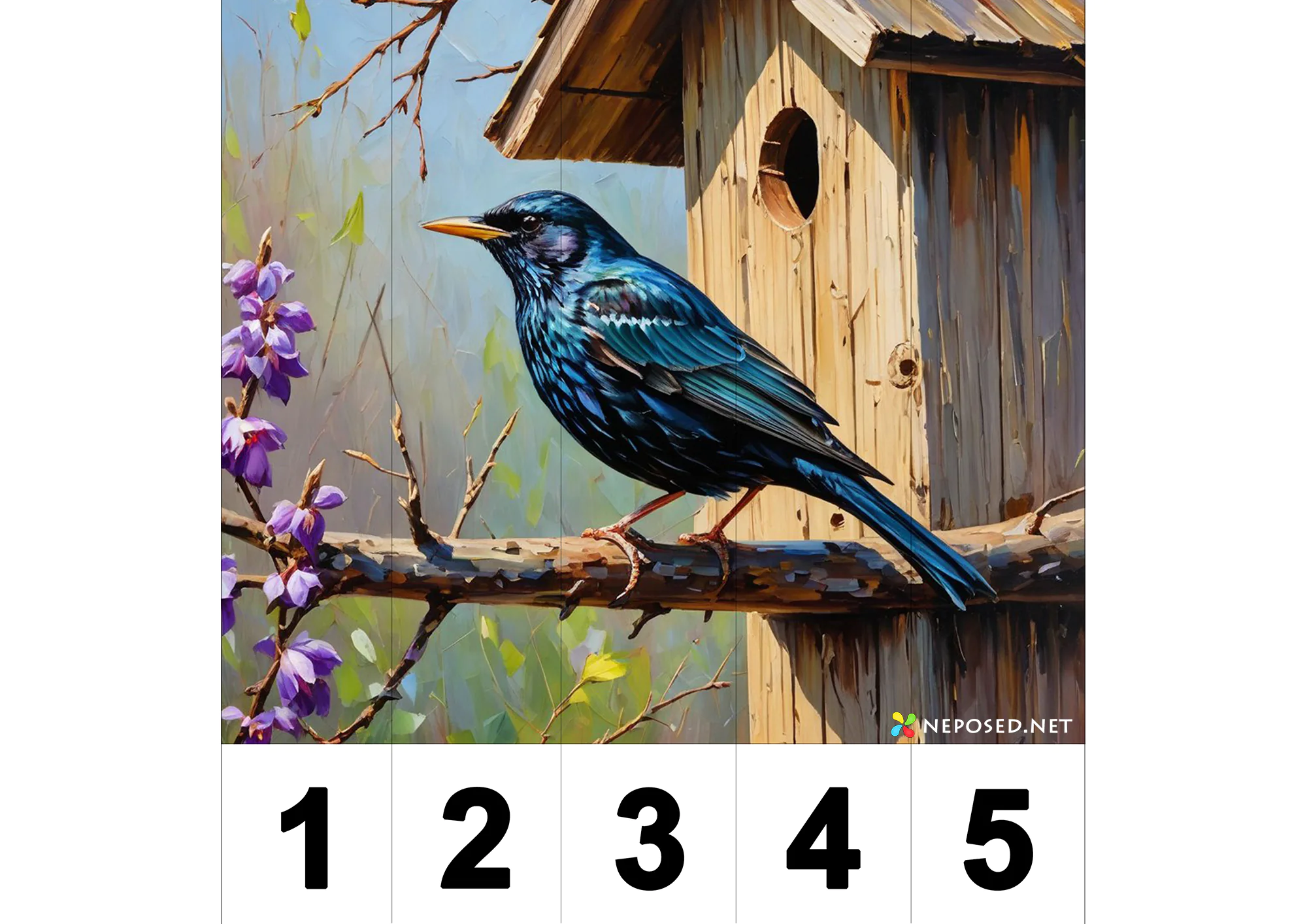 На каждом пазле — весеннее изображение, разделённое на полоски с цифрами. Чтобы собрать картинку, малыш должен выстроить числа по порядку.